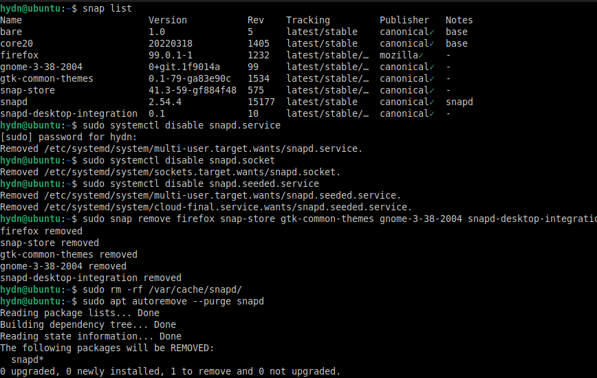 之前安装 Ubunu 22.04 LTS 系统后,发现 firefox 打开就崩溃,查了下网上说了 snap 的缘故,删除即可恢复正常。步骤如下: