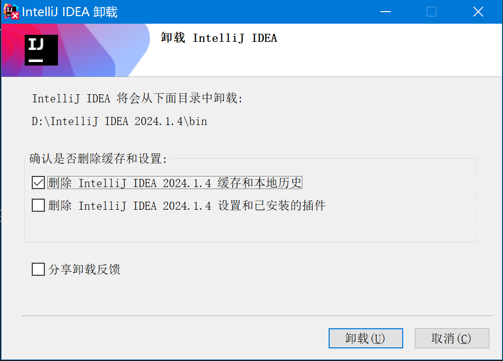 - 第一步先卸载老版本 IDEA, 建议勾选删除缓存和本地历史